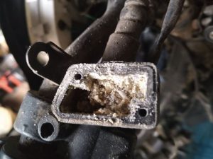 Este es el estado del fluido de frenos después de mucho tiempo sin cambiarlo. Primero va adquiriendo una densidad opaca (acá es cuando los mecánicos «a ojo» ya empezamos a pedir el cambio por seguridad) y con el tiempo se cristaliza hasta terminar convirtiéndose en polvo. En este caso no tuvimos mayores problemas, limpiamos todo el circuito, cambiamos las partes de goma de la bomba y con pastillas y líquido nuevo esta parte ya quedó como nueva.